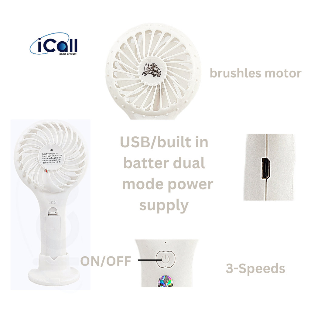 icall Mini Portable LD3 Hand Fan (3 Speed) modes Build-in Rechargeable Battery with Table Holder Powerful Rechargeable Fan