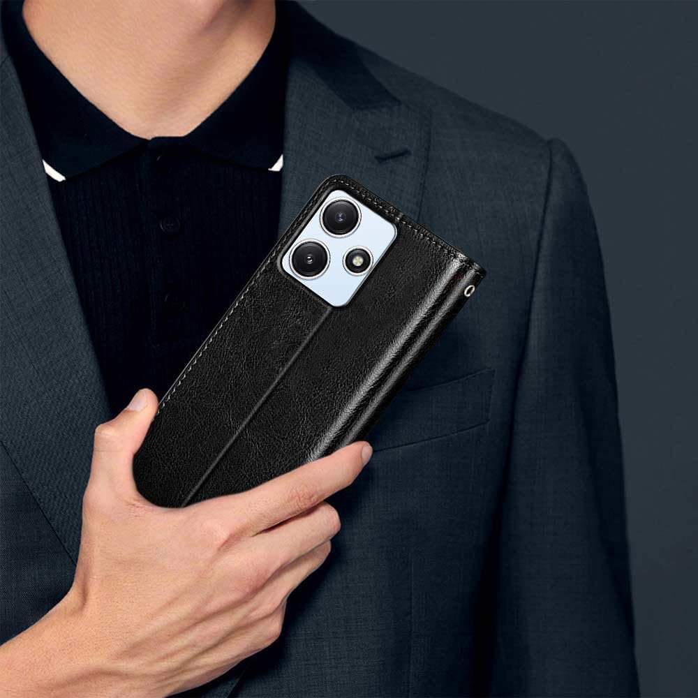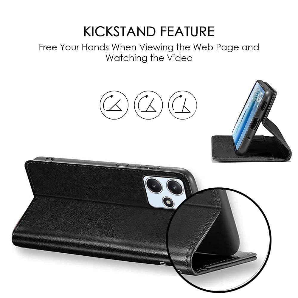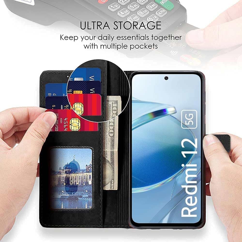 icall Shock Proof Flip Cover Back Case Cover for Redmi 12 5G / Poco M6 Pro 5G (Flexible | Leather Finish | Card Pockets Wallet & Stand