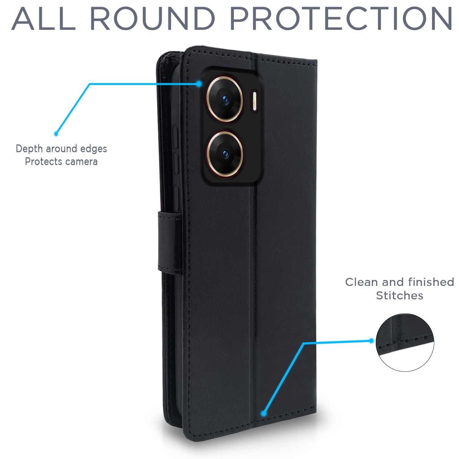 - Premium Faux Leather Finish. Comes with the In-Built Kick stand, for easy use on any surface