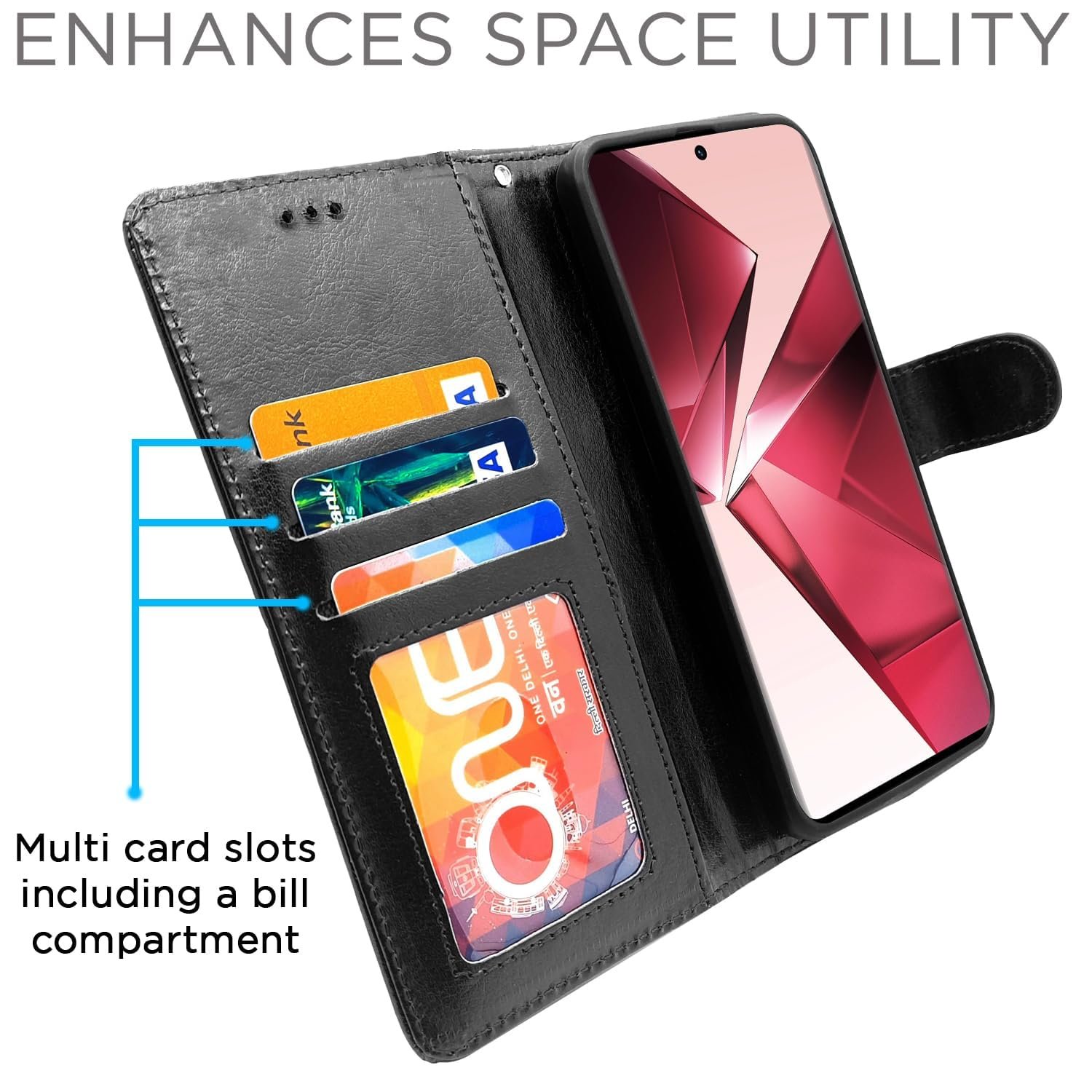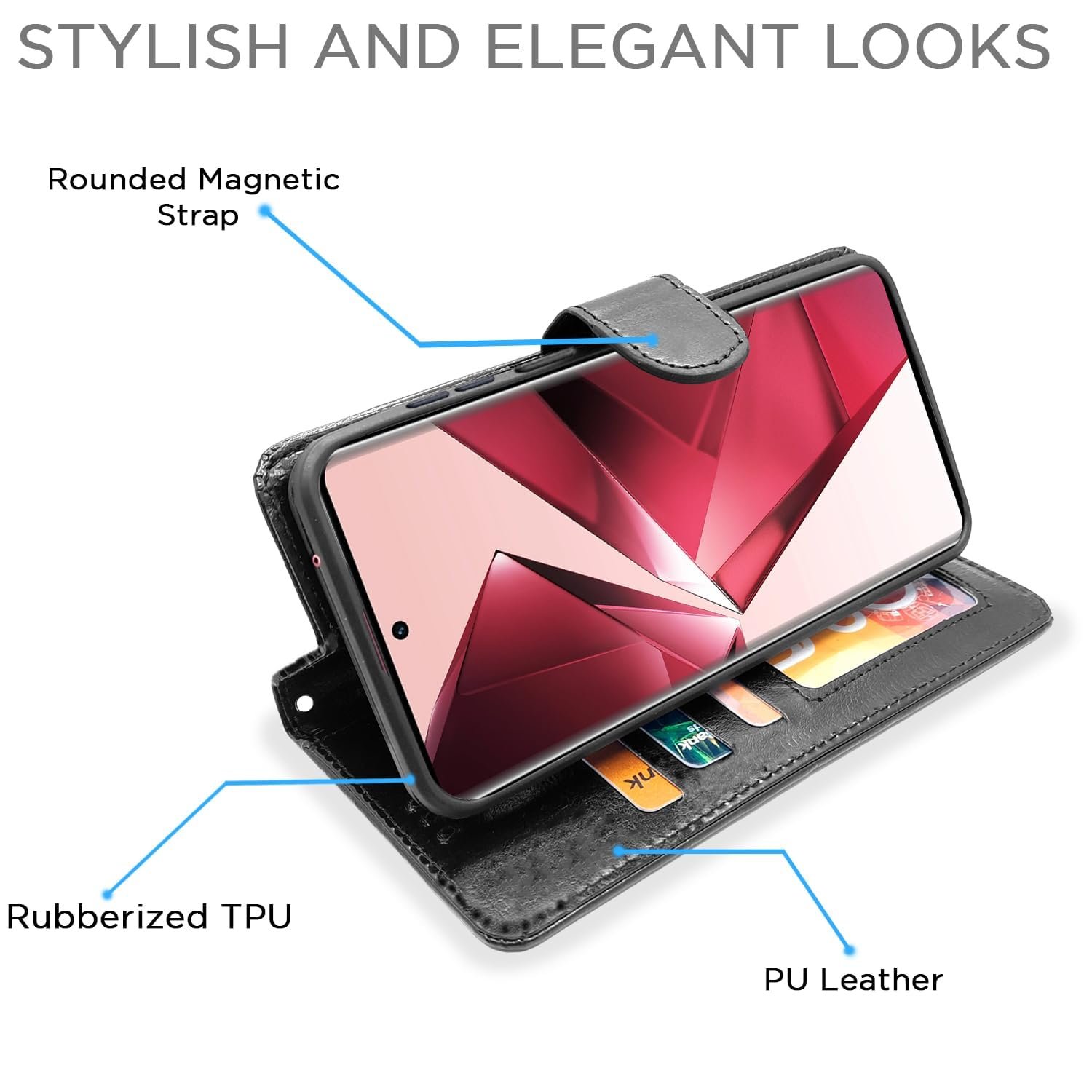 - Protective flip case with card pockets, wallet design, and magnetic closure